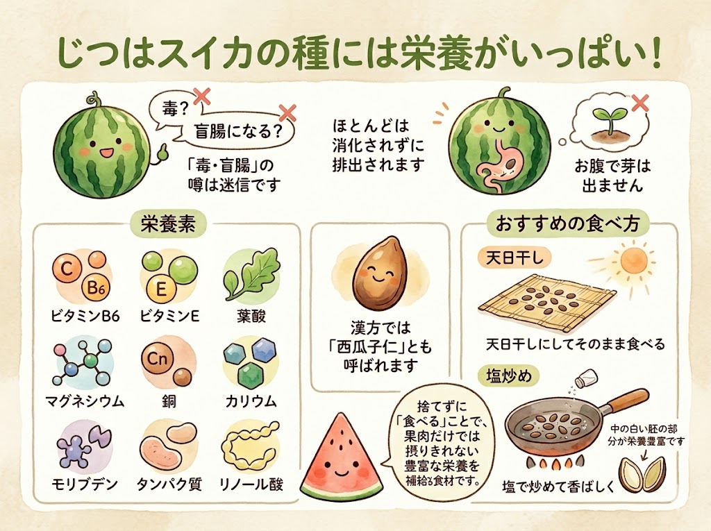 スイカの種について「毒がある」「食べると盲腸になる」という話を聞いたことがある方も多いと思います。結論として、これらはすべて迷信です。